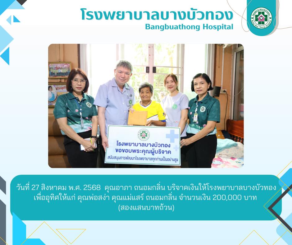 โรงพยาบาลบางบัวทอง ขอขอบคุณ คุณอาภา ถนอมกลิ่น บริจาคเงินให้โรงพยาบาลบางบัวทอง เพื่ออุทิศให้แก่ คุณพ่อสง่า คุณแม่แสร์ ถนอมกลิ่น จำนวนเงิน 200,000 บาท (สองแสนบาทถ้วน)